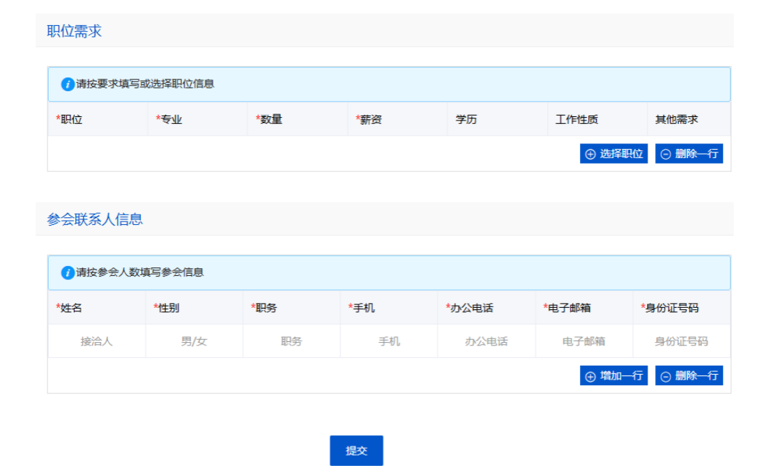 单位需填写招聘会展位预定报名表和职位需求表(可从历史发布的职位中选择,也可新增)以及参会联系人信息等。