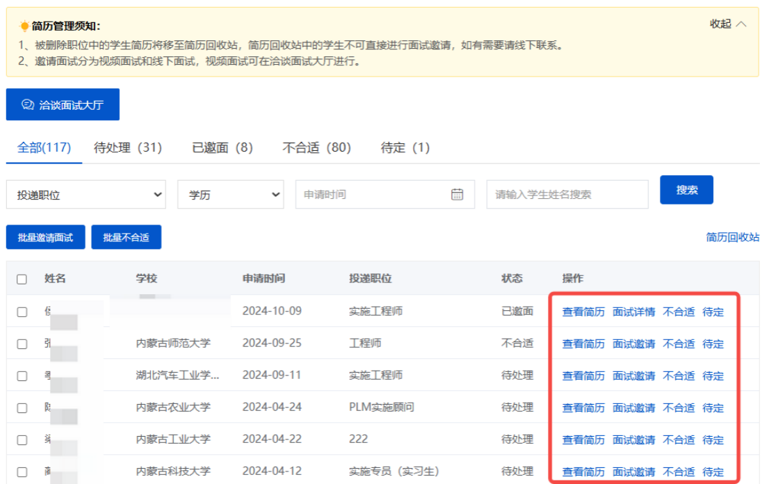 点击【招聘管理】—【简历管理】查看学生投递的简历,并对简历进行标记。