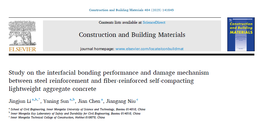 工业与城市固体废弃物建材资源化利用团队李京军教授在Construction and Building Materials期刊(IF=8.0,中科院1区TOP)发表题为“Study on the interfacial bonding performance and damage mechanism between steel reinforcement and fiber-reinforced self-compacting lightweight aggregate concrete”(DOI: 10.1016/j.conbuildmat.2025.141845)的研究成果。该研究系统探究了纤维增强自密实轻骨料混凝土与钢筋的界面粘结性能与损伤机理,通过11组中心拔出试验分析了强度等级、纤维掺量与钢筋直径对粘结滑移行为的影响,结合有限元模拟揭示了损伤机制,建立了极限粘结强度计算公式与粘结-滑移本构模型,并验证了纤维桥联效应对抑制裂缝扩展的关键作用。