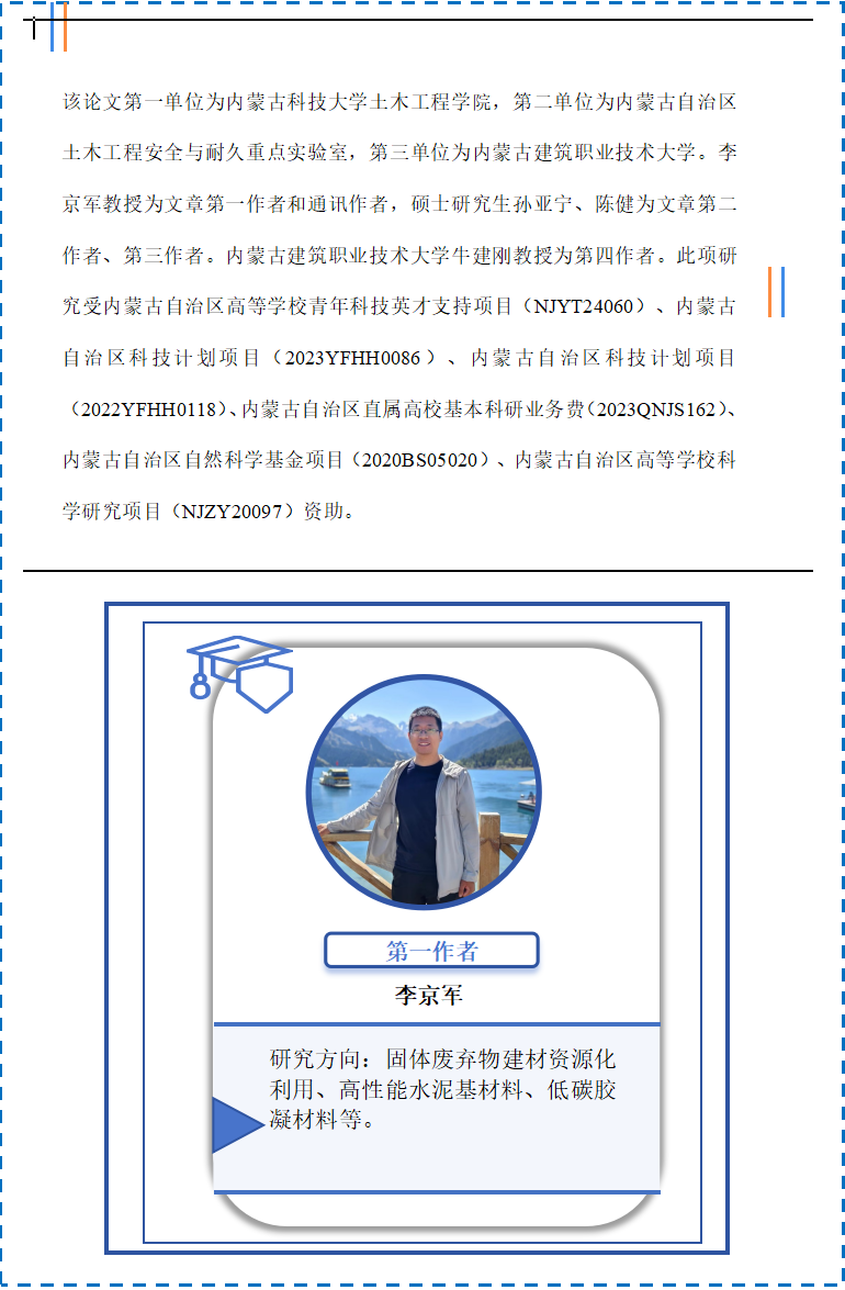 李京军,工学博士,教授(破格),硕士研究生导师,内蒙古自治区优秀青年基金获得者,入选内蒙古自治区“青年科技英才”、“英才兴蒙”和包头市“鹿城英才”、青年创新人才等人才专项计划。主要从事固体废弃物建材资源化利用和高性能水泥基材料方面的基础和应用研究。近五年,作为项目负责人主持国家自然科学基金、内蒙古自治区重点研发(4项)、中央引导地方项目、内蒙古优秀青年基金等国家级及省部级项目12项,地市级项目3项,企业项目2项,累计课题经费500余万元。累计发表高水平期刊论文40余篇,其中,中科院一区SCI(TOP期刊)15篇,授权发明专利5项,参与制定标准5部。