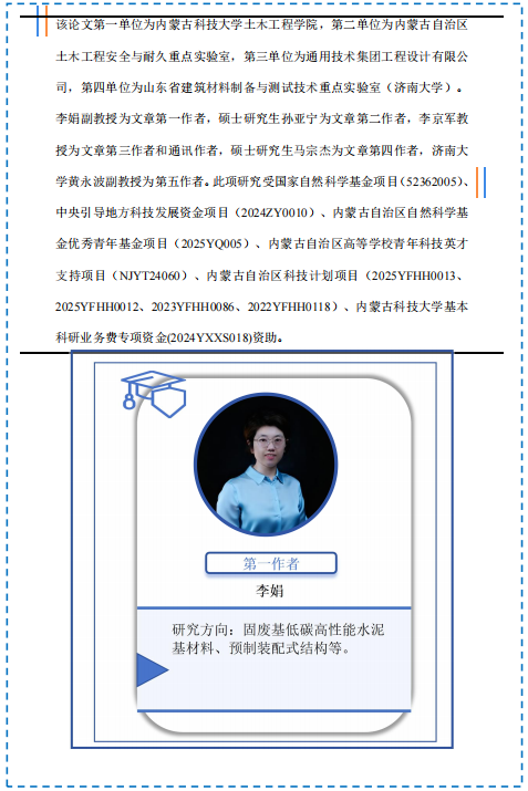 李娟,副教授,硕士生导师,主要从事固废基低碳高性能水泥基材料以及预制装配式结构等方面的基础和应用研究,主持、参与各级各类纵、横向科研项目十余项,主持、参与教育部产学合作协同育人项目及其他各级各类教研项目十余项,授权发明专利3项,实用新型专利2项、软件著作权2项,曾获得全国工科结构力学及弹性力学课程青年教师讲课竞赛一等奖等各级教学竞赛奖7项,被评为“内蒙古自治区高等学校土木工程专业高校优秀指导教师”、“大学生结构设计竞赛优秀指导教师奖”、“师风师德先进个人”、“优秀教师”、“教学新秀”、“优秀班主任”。