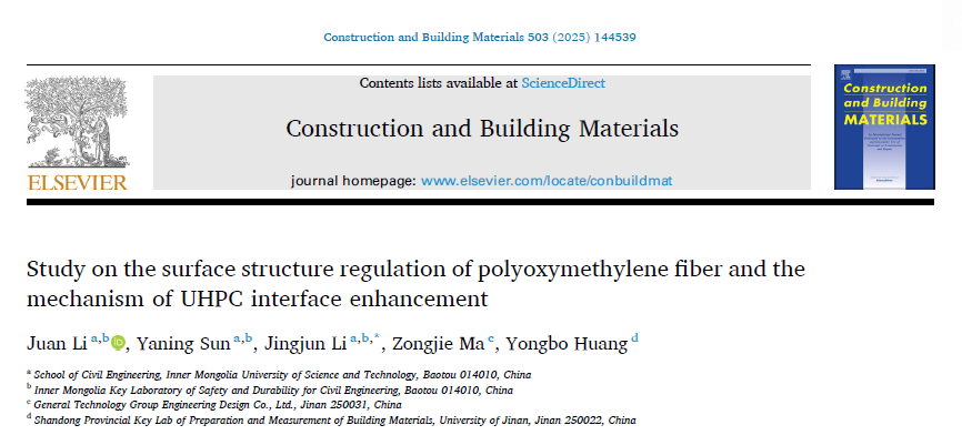 工业与城市固体废弃物建材资源化利用团队李娟副教授在Construction and Building Materials期刊(IF=8.0,中科院1区TOP)发表题为“Study on the surface structure regulation of polyoxymethylene fiber and the mechanism of UHPC interface enhancement”(DOI: 10.1016/j.conbuildmat.2025.144539)的研究成果。该研究系统探究了纳米二氧化硅改性聚甲醛纤维对矿渣硫铝酸盐水泥基UHPC界面性能的调控机制,通过硝酸预处理与硅烷偶联剂(KH550、KH560、KH570)辅助的溶胶-凝胶法实现了纤维表面结构优化,结合拉拔试验、SEM/EDS、AFM、FTIR与接触角测试,系统分析了改性纤维的界面粘结行为与增强机理,揭示了表面粗糙度提升与化学键合增强对界面性能的协同作用,并验证了改性纤维在提升粘结强度与耗能方面的显著效果,同时论证了该体系在降低碳排放方面的可持续性优势。