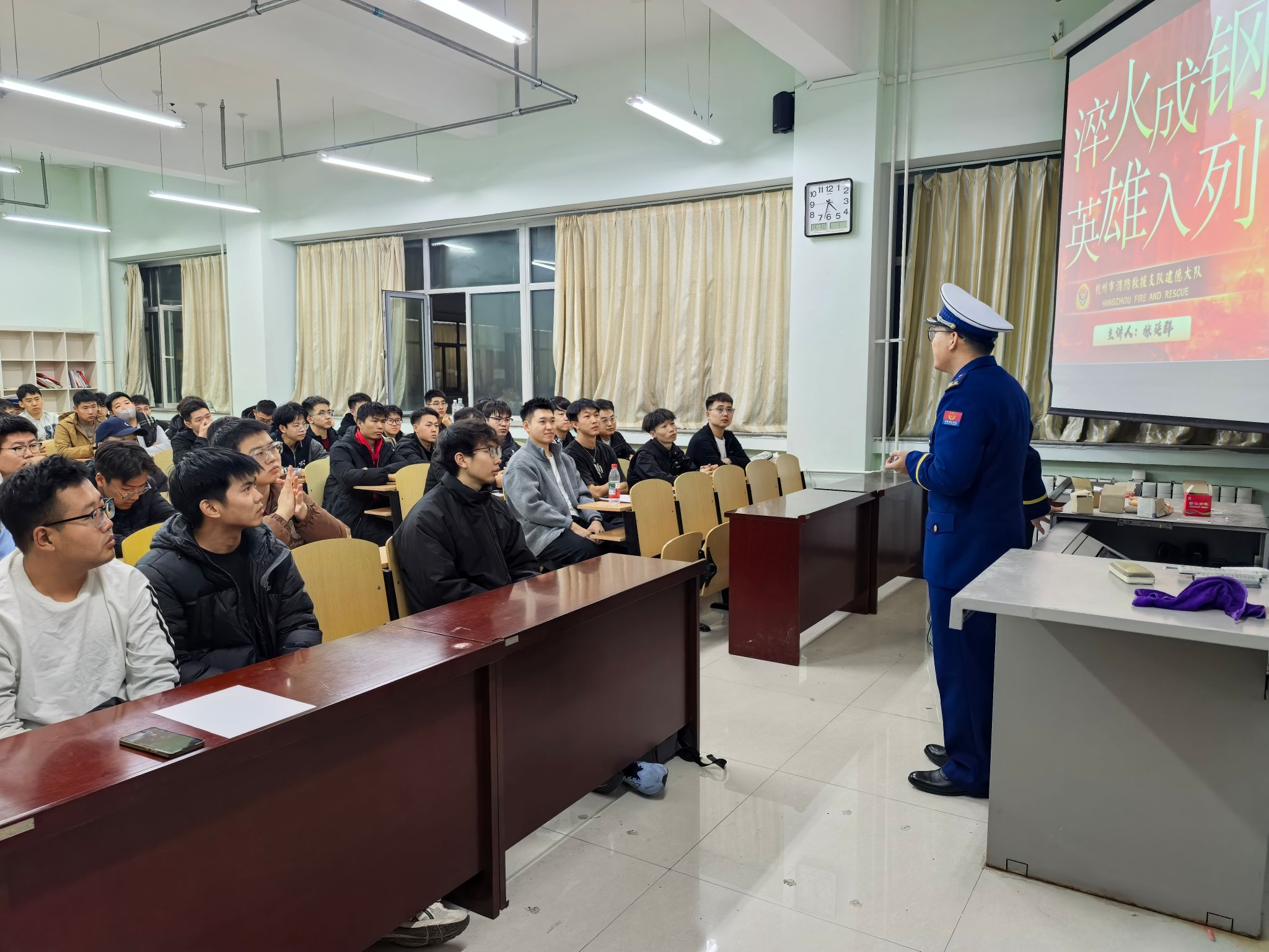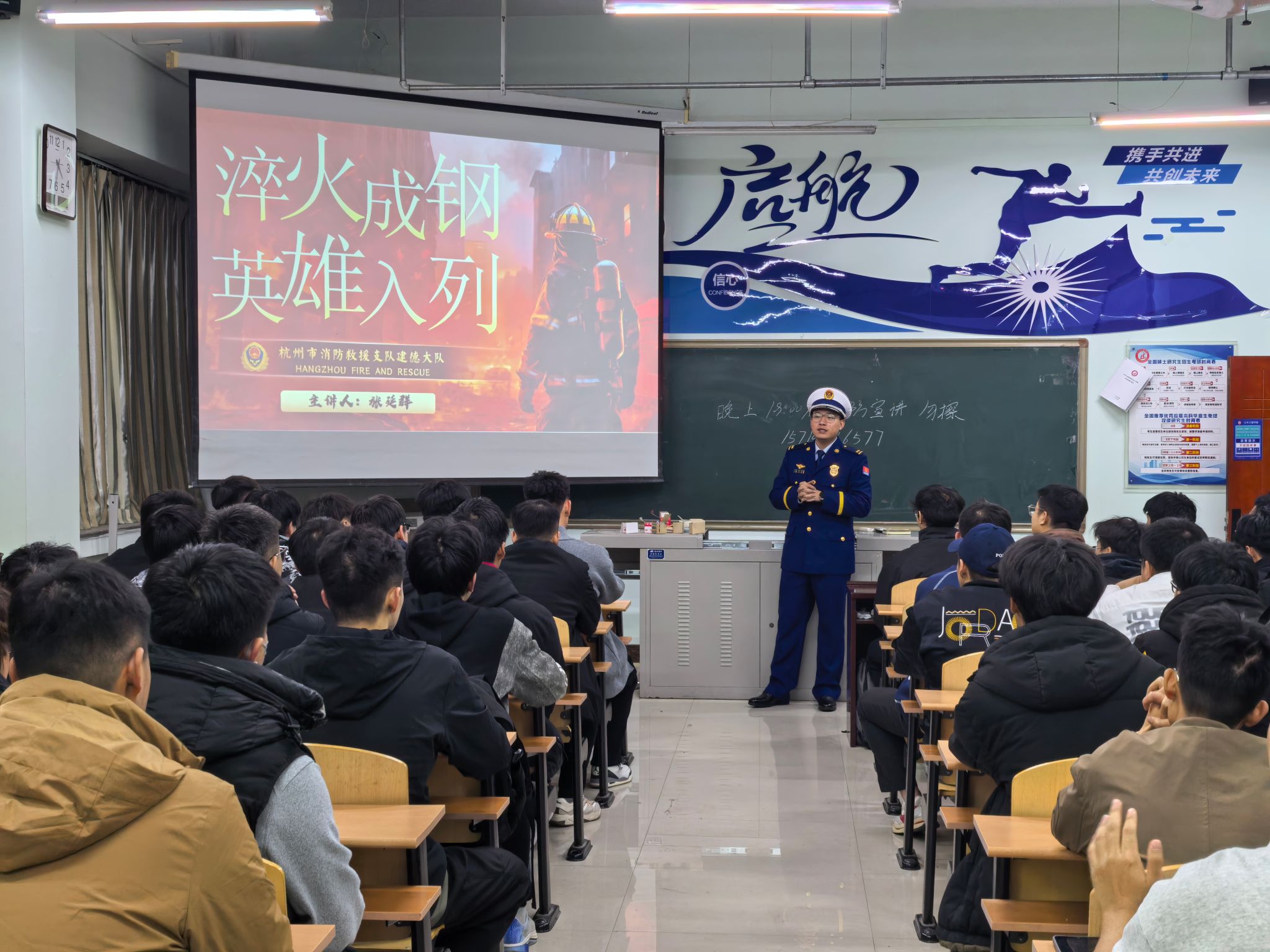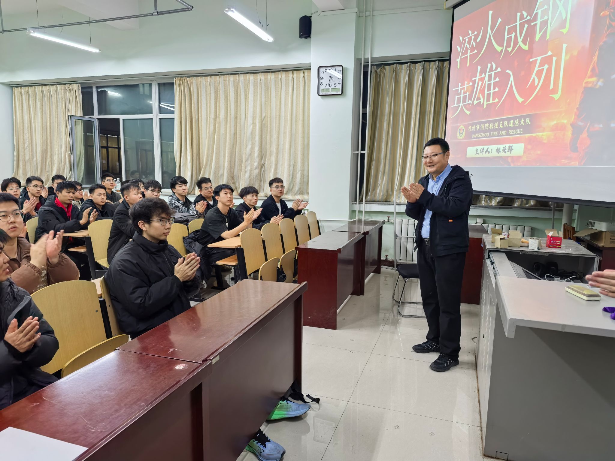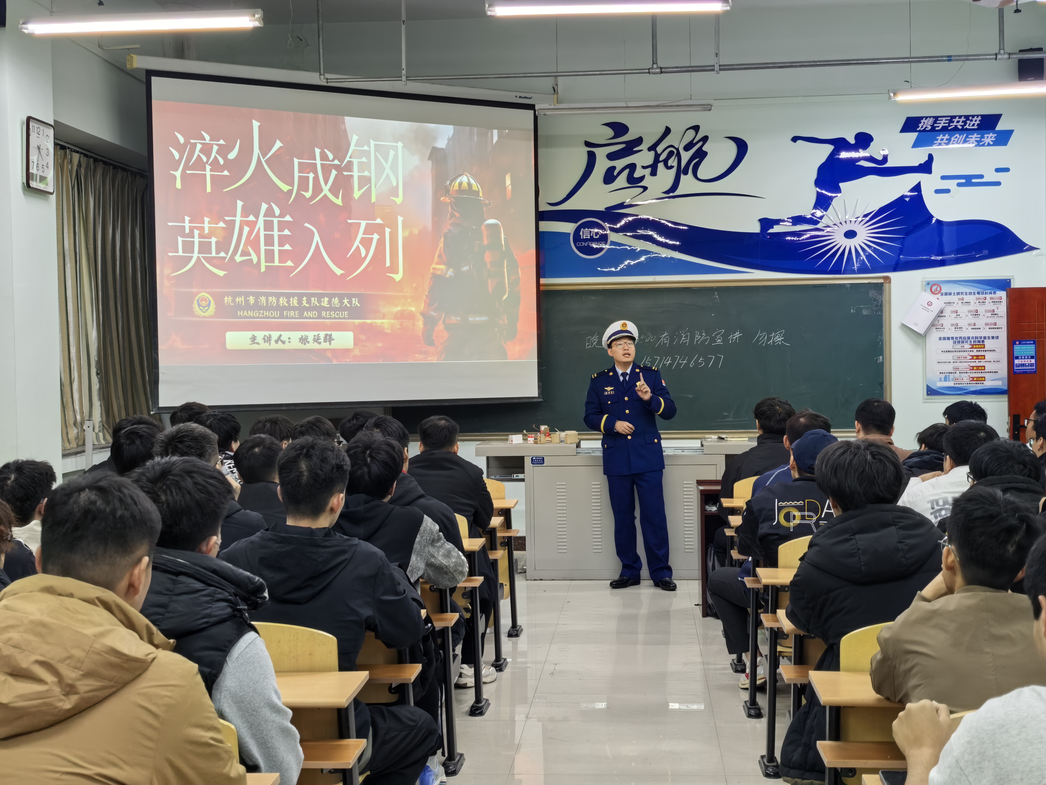2025年11月7日晚19:30,杭州市消防救援支队建德大队“淬火成钢 英雄入列”招录宣讲会在逸夫楼F401教室开讲,众多大四同学积极参与。